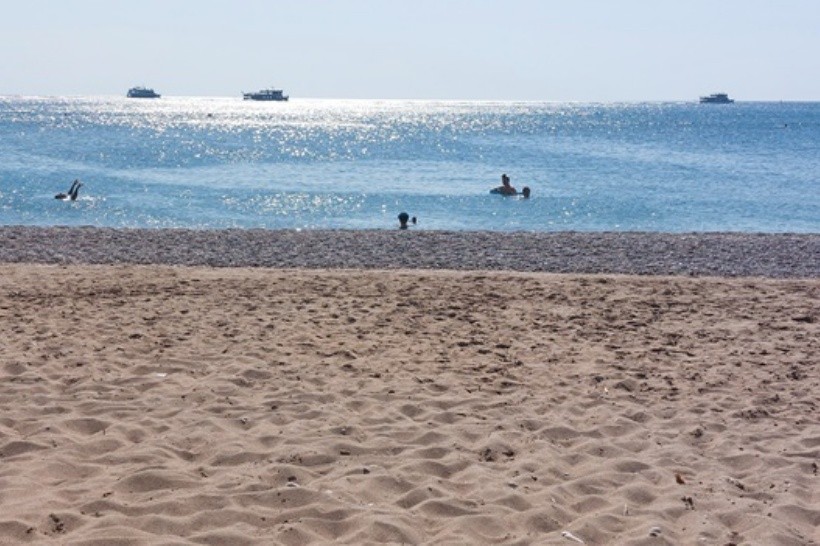 Příjemná, široká písčito-oblázková pláž s pozvolným vstupem do moře, průzračně čistou vodou a sezónní nabídkou motorizovaných i nemotorizovaných vodních sportů (za