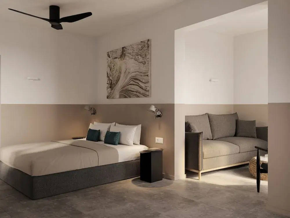 Suite s odděleným obytným prostorem a ložnicí, balkon/terasa a výhled (obvykle moře), ideální pro delší pobyty a komfortnější ubytování.