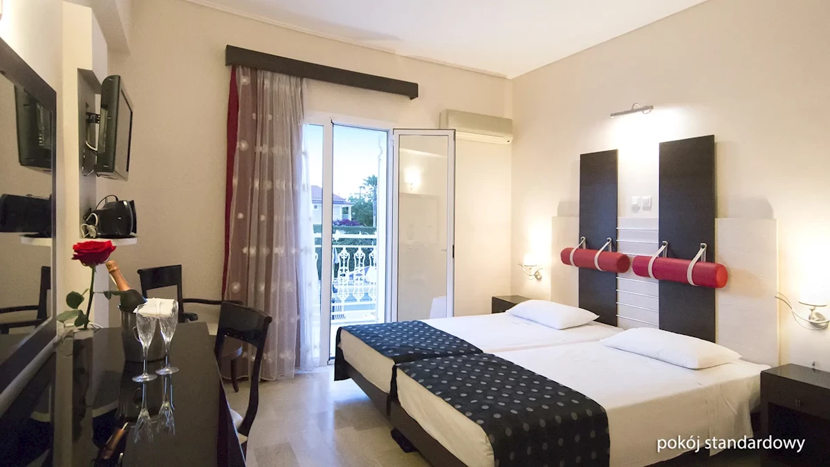 Po příjezdu jsme byli ubytováni v pokoji, který byl na straně cesty u Laganas. Pokoj úplně neodpovídal našemu očekávání, navíc klimatizace fungovala tak možná napůl, dveře od balkonu nedovíraly a vzhledem k extrémní hlučnosti na ulici, kde do 6h ráno probíhaly každý den párty, to nebylo dobré a nedalo se spát. Každopádně nebyl problém po 2 dnech, kdy se uvolnil jiný pokoj, nám jej vyměnit.
