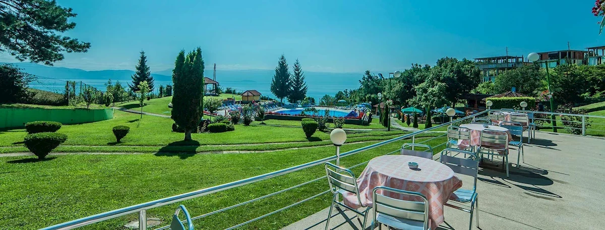 Lotnisko w Skopje oddalone jest o około 209 km. Do centrum Strugi jest około 7 km, a przystanek autobusowy znajduje się około 10 m od hotelu. Koszt przejazdu autobusem wynosi około 1 EUR za osobę, a taksówką około 5 EUR. Do Ochrydy jest około 20 km, a koszt przejazdu taksówką wynosi około 17 EUR. Jezioro Ochrydzkie znajduje się w odległości około 200 m. Przystanek autobusowy znajduje się około 10 m od hotelu, a także dostępne są usługi taksówkowe. Hotel położony jest w miejscowości Elen Kamen, w otoczeniu zieleni, z malowniczym widokiem na Jezioro Ochrydzkie, w sąsiedztwie hotelu Izgrev Spa & Aquapark.Program sportowy i animacyjny