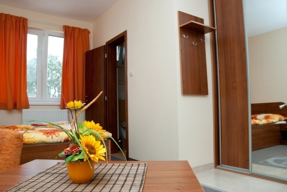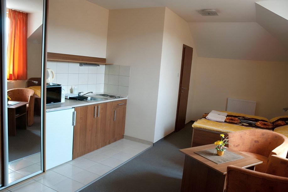 Dvojlůžkový pokoj s možností přistýlky (rozkládací křeslo) s plně vybavenou kuchyní (2 pl vařič, mvl trouby, varná konvice, nádobí na vaření, jídelní soupravy + příbory, lednice, dřez + mycí houba+ přípravek na mytí nádobí + utěrka), K dispozici stojací sušák,. 2 křesla + (pouze) konferenční stolek. Koupelna s WC, umývadlem a sprchovým koutem. problematické uzavírání sprchové zástěny (instalován levný nekvalitní výrobek). Pokuj i WC s koupelnou čisté.