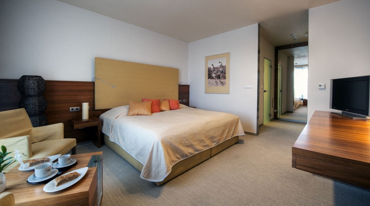 b. ubytování v apartmá Deluxe pro 2–4 osoby s ložnicí a obývacím pokojem, dvě koupelny (masážní sprcha, vana, fen, toaleta), LCD TV/SAT, internetovým připojením zdarma, hotelovou kosmetikou, županem, minibarem a hotelovou službou.