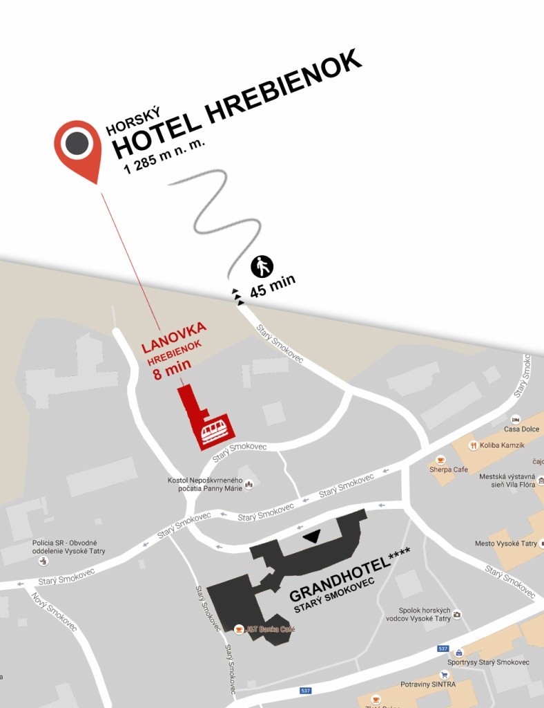 V její blízkosti je stanice pozemní lanovky ve Starém Smokovci. V ubytovně je jídelna se samoobsluhou, restaurace, bar, kavárna, klubovna, masáže a dva salonky. Horská ubytovna Hrebienok je umístěná překrásné scenérii Vysokých Tater v nadmořské výšce 1 285 m pod úpatím Lomnického a Slavkovského štítu. Ubytovna se nachází přímo mezi sjezdovkami. Nad ubytovnou je sjezdovka pro náročné lyžaře, pod ubytovnou menší svah vhodný pro lyžařskou školu, sáňkování i bobování.