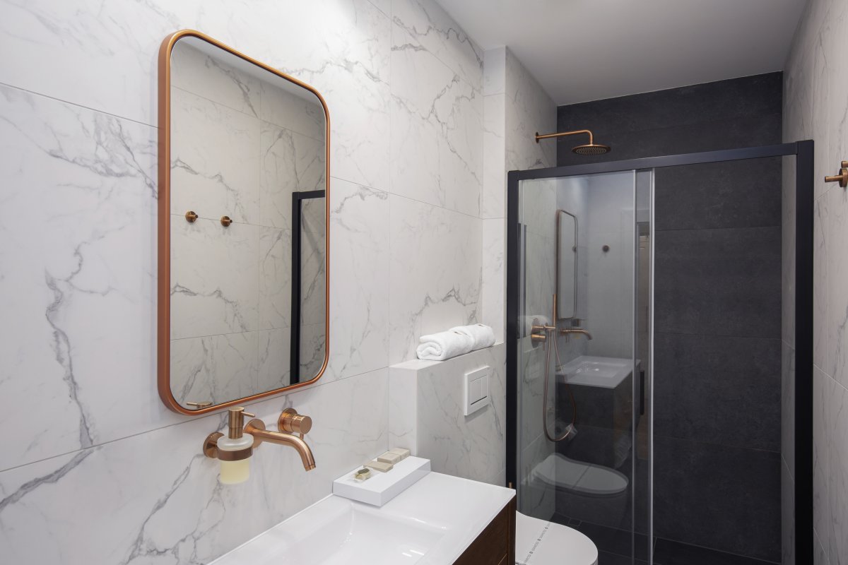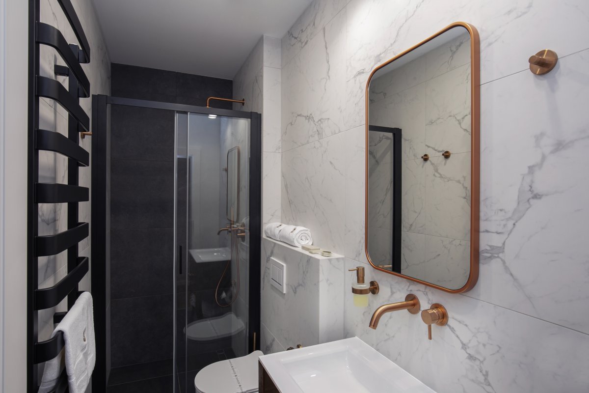 koupelna se sprchovým koutem a toaletou