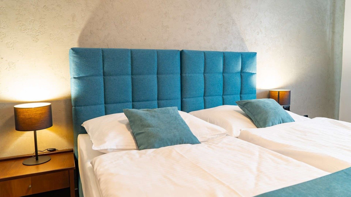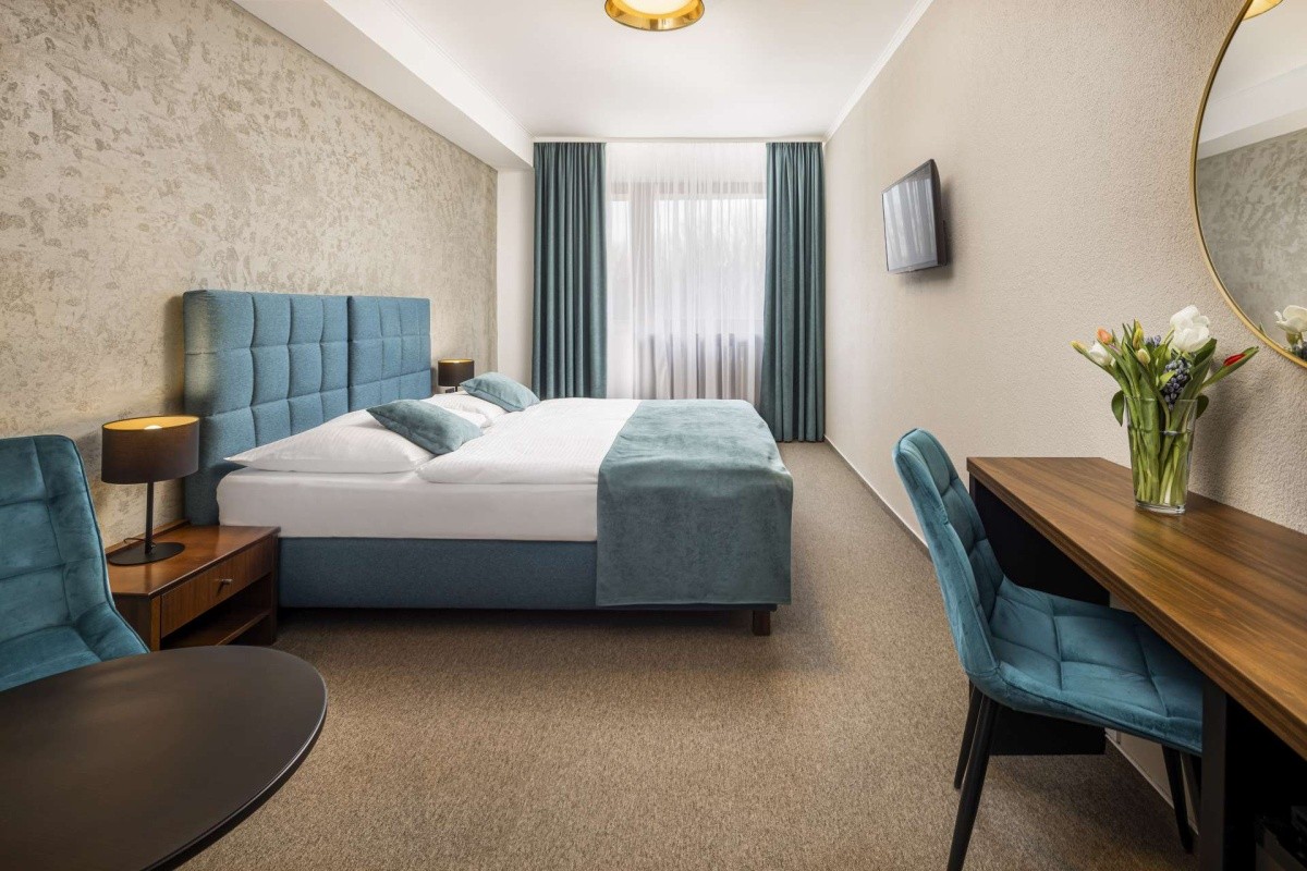 V komfortně zařízených dvoulůžkových pokojích na kartový systém s vlastním sociálním zařízením (renovované koupelny), LCD-TV, rádiem, telefonem, fénem, minibarem, trezorem, stojanem na odkládání kufrů, klimatizací a balkónem. LED nasvícený pokoj v 5. poschodí.