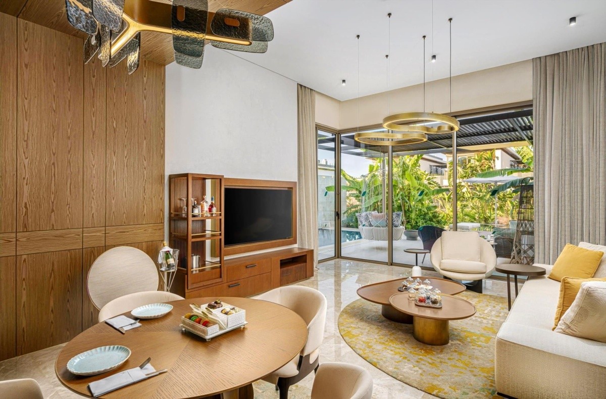 Vila, 1 spálňa: 2x Kúpeľňa/WC (sušič a narovnávač vlasov), klimatizácia, obývacia izba s jedálenskou časťou a plne vybavenou kuchynskou linkou (vr. umývačky riadu), spálňa so šatníkom, TV/sat., žehlička a žehliaca doska, trezor (zdarma), minibar (zdarma), terasa s prístupom do opticky oddeleného zdiaľaného bazéna, služby komorníka (za poplatok), celkom cca 246 m2 (vr. bazéna a terasy, samostatná vila má cca 109 m2).