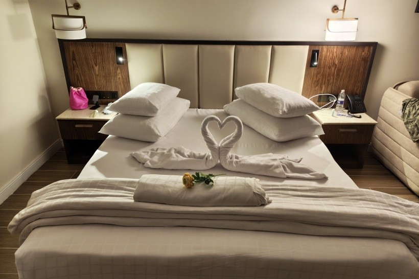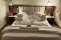 Pokoj v budově bungalovového typu, velký, cca 60 m2, obrovská manželská postel a mega pohodlná matrace.