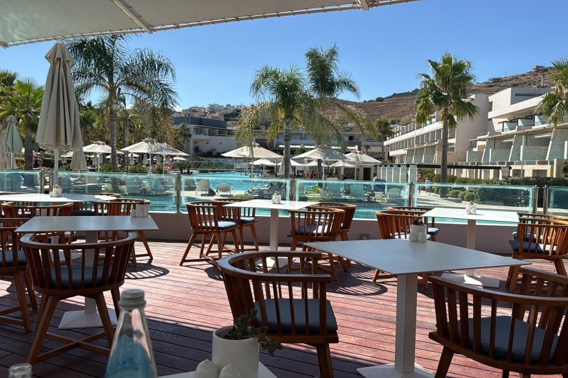 Stravování v samostatně stojící restauraci u bazénu bylo skvělé. Samozřejmě převládají místní potraviny - ryby, zelenina, sýry včetně ovčích a kozích, olivy, v menší míře vepřové nebo hovězí maso, trochu nám chybělo více jehněčího masa.